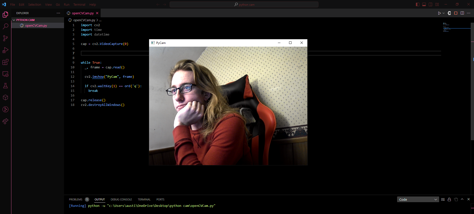 The code here is a simple camera output using OpenCV. This instantiates a capture class and then loops through frames and then when you want it to stop you hit the letter 'q'.